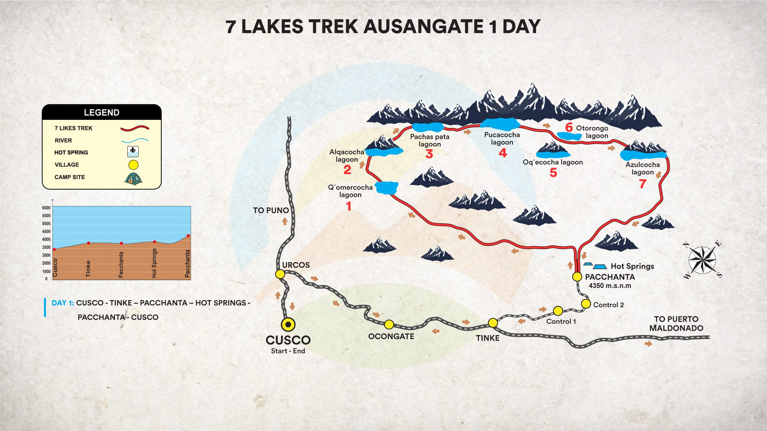 • Altitud: Cusco (3,350 m) – Tinki (3,800 m) – Upis (4,400 m) – Ninaparayoc (4,800 m)