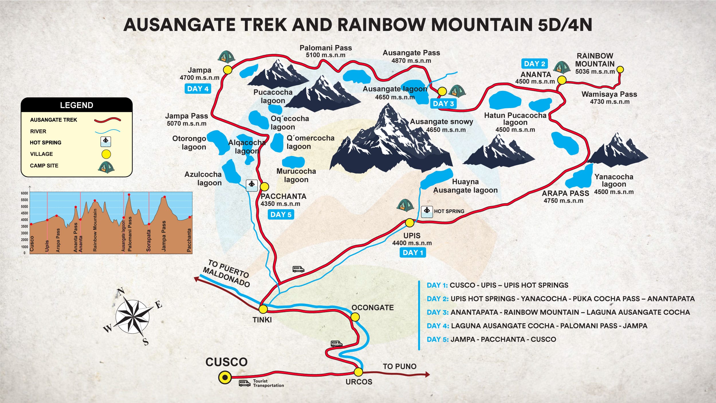 Comenzaremos la caminata hacia el punto más alto de la ruta: el Paso Palomani (5,100 m s. n. m.), desde donde se tiene una vista panorámica espectacular del nevado Ausangate, el más alto de Cusco (6,384 m s. n. m.). Luego descenderemos a Finaya Pampa, donde veremos llamas, alpacas, vicuñas silvestres e incluso, con suerte, cóndores. Finalmente llegaremos a Jampa (4,700 m s. n. m.), donde acamparemos.