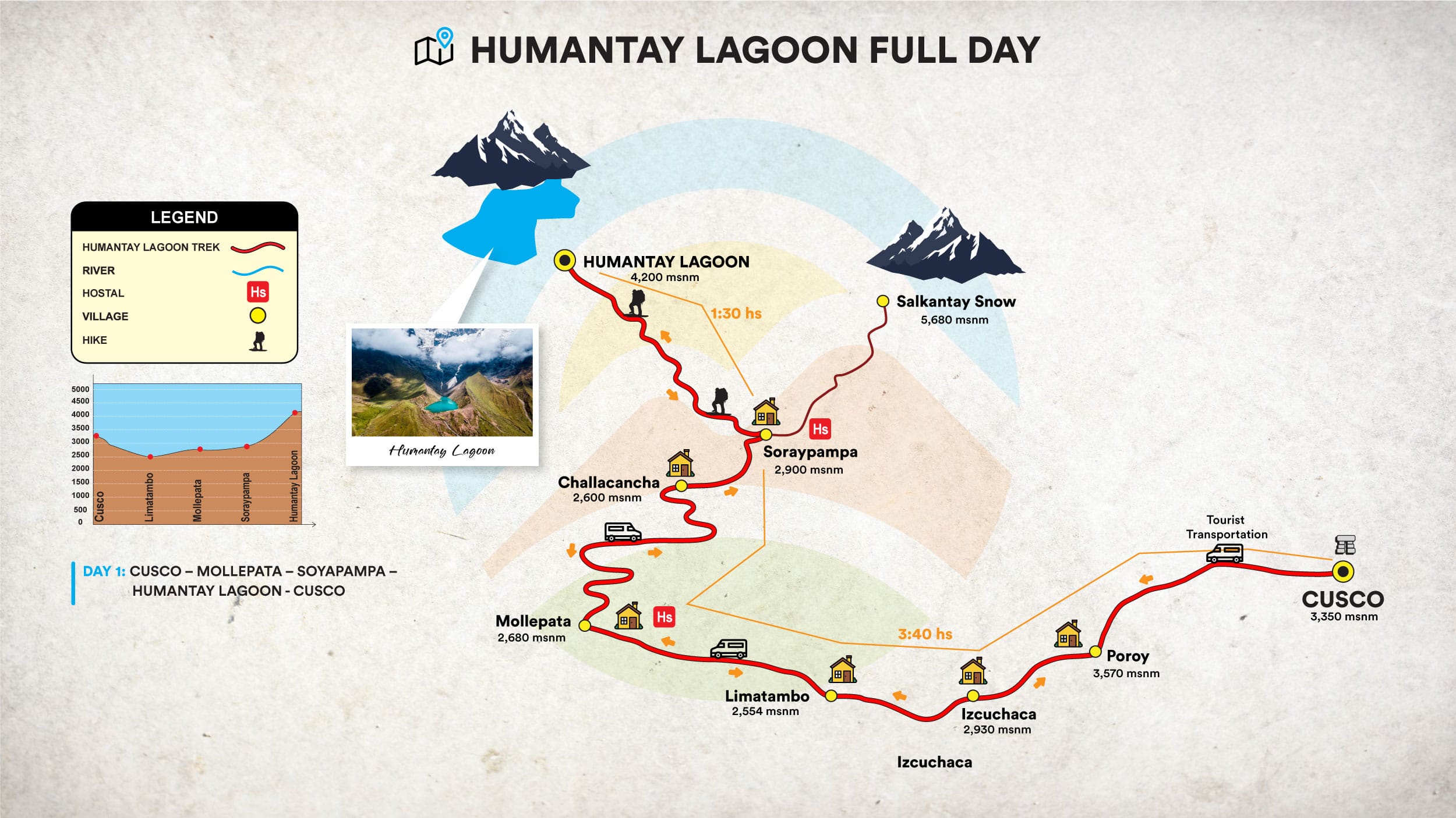La caminata al Lago Humantay dura un día completo y el itinerario incluye la recogida en los hoteles, desayuno en Mollepata, charla previa a la caminata en Soraypampa, ascenso hasta la laguna, regreso a Soraypampa, almuerzo en Mollepata y retorno a Cusco.