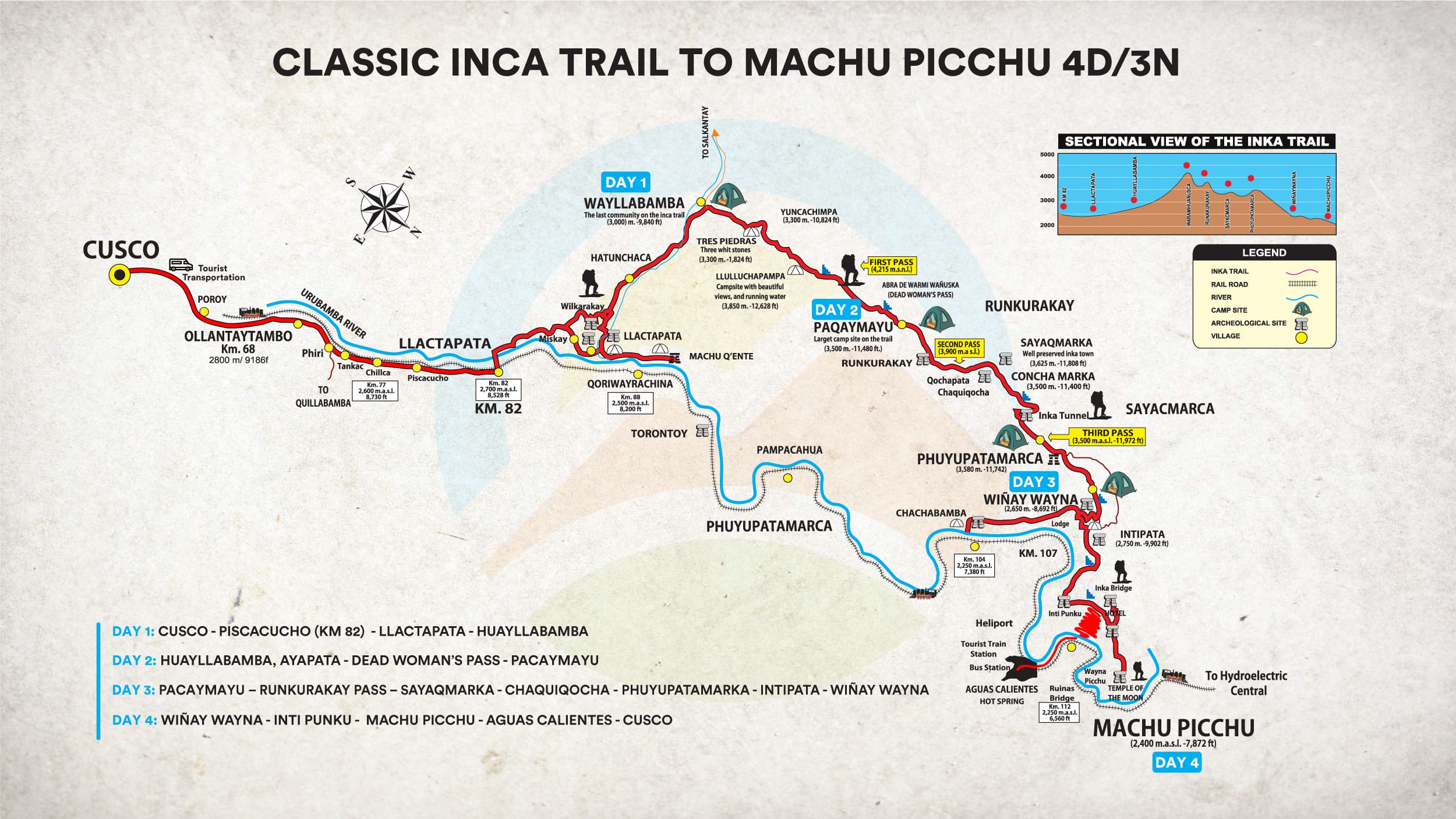 El Camino Inca de 4 días tiene una distancia total de 40 km, distribuidos día por día. El día más difícil es el segundo, ya que se asciende al punto más alto del recorrido: el paso Warmiwañusca (la mujer muerta), a 4,223 m s. n. m.