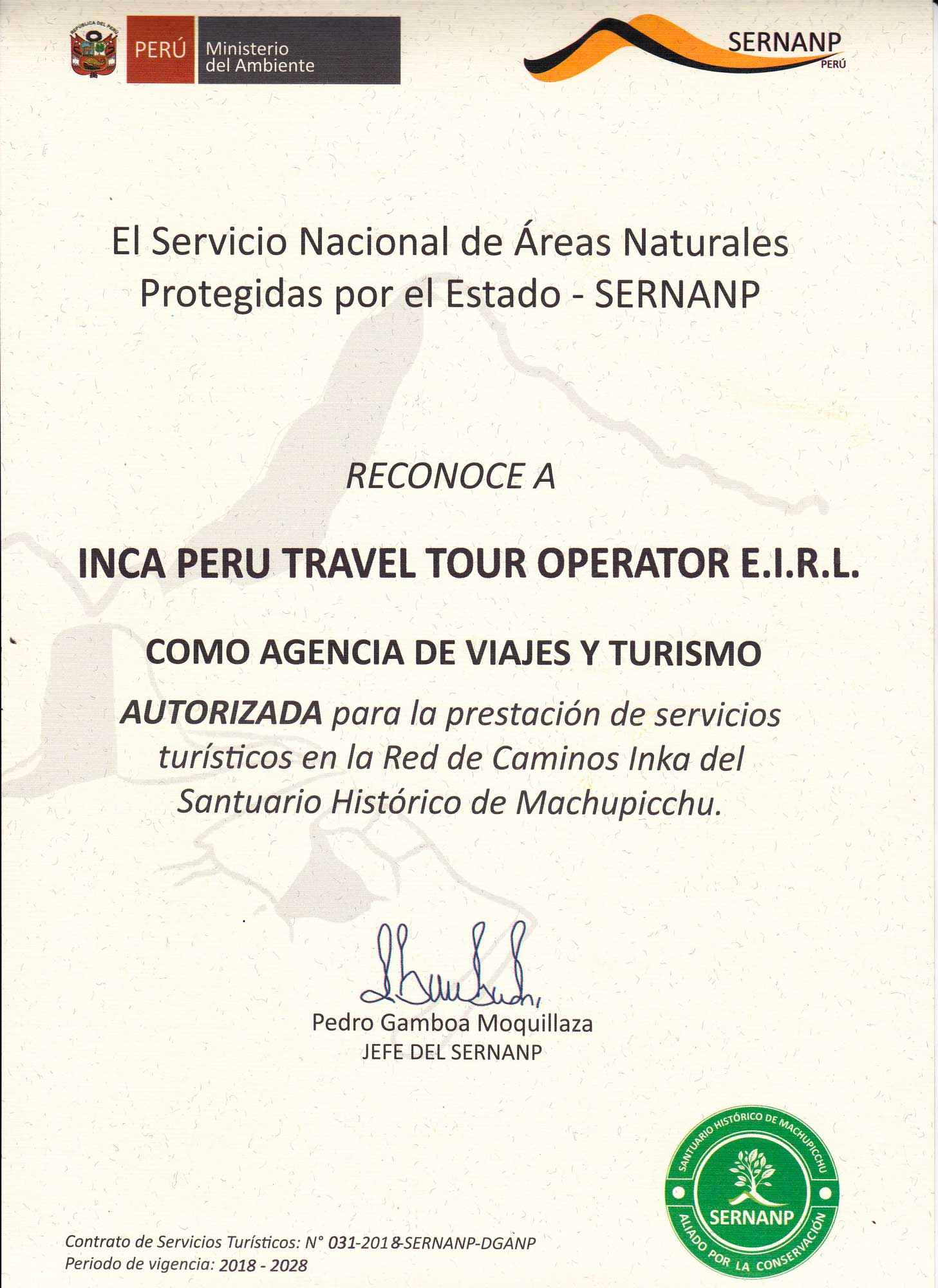 Operador Autorizado de servicios turísticos en la Red de Camino Inca