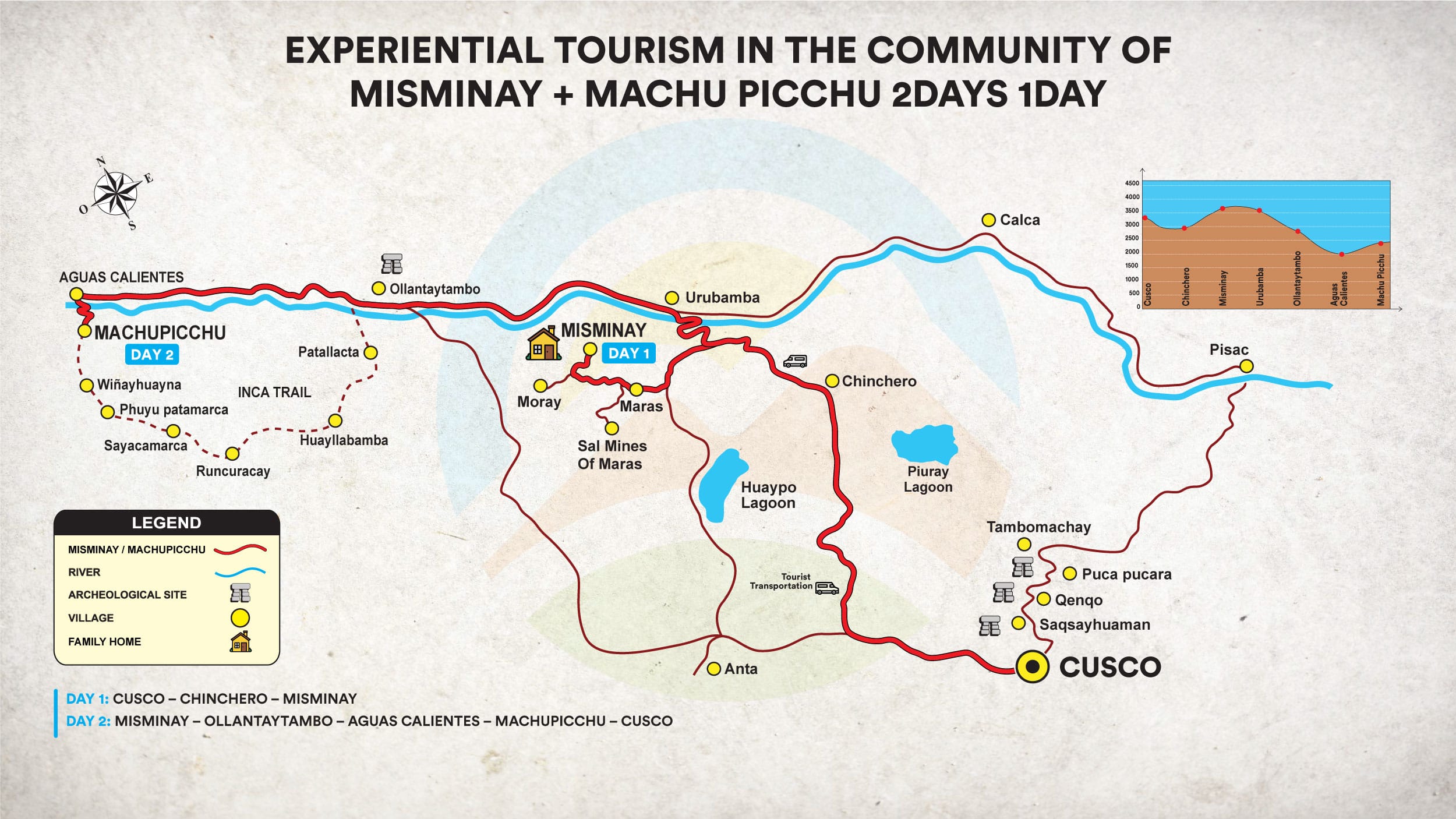 El viaje dura dos días. El primer día se realizan talleres y actividades en la comunidad de Misminay, seguido de alojamiento y cena. El segundo día visitamos Machu Picchu con una visita guiada y regresamos a Cusco.