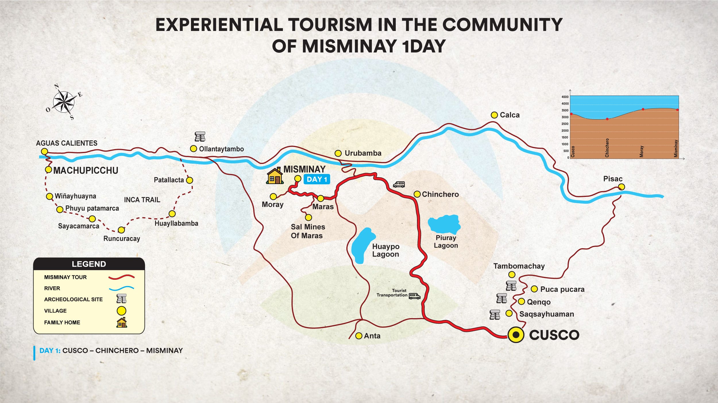 La Comunidad Campesina de Misminay se encuentra aproximadamente en un tiempo de 1 hora 30 minutos de la ciudad de Cusco, 54 Km, se encuentra a una altitud de 3700 msnm. En el camino visitaremos el distrito de Maras donde podremos disfrutar de un paisaje natural único de esta zona andina, afortunados de poseer el mayor lienzo de estrellas en todo Cusco. Misminay es una comunidad que mantiene viva sus costumbres ancestrales, familias que mantienen su relación con la naturaleza a través de la agricultura utilizando técnicas tradicionales de cultivo en terrazas, la lengua predominante en Misminay es el quechua.